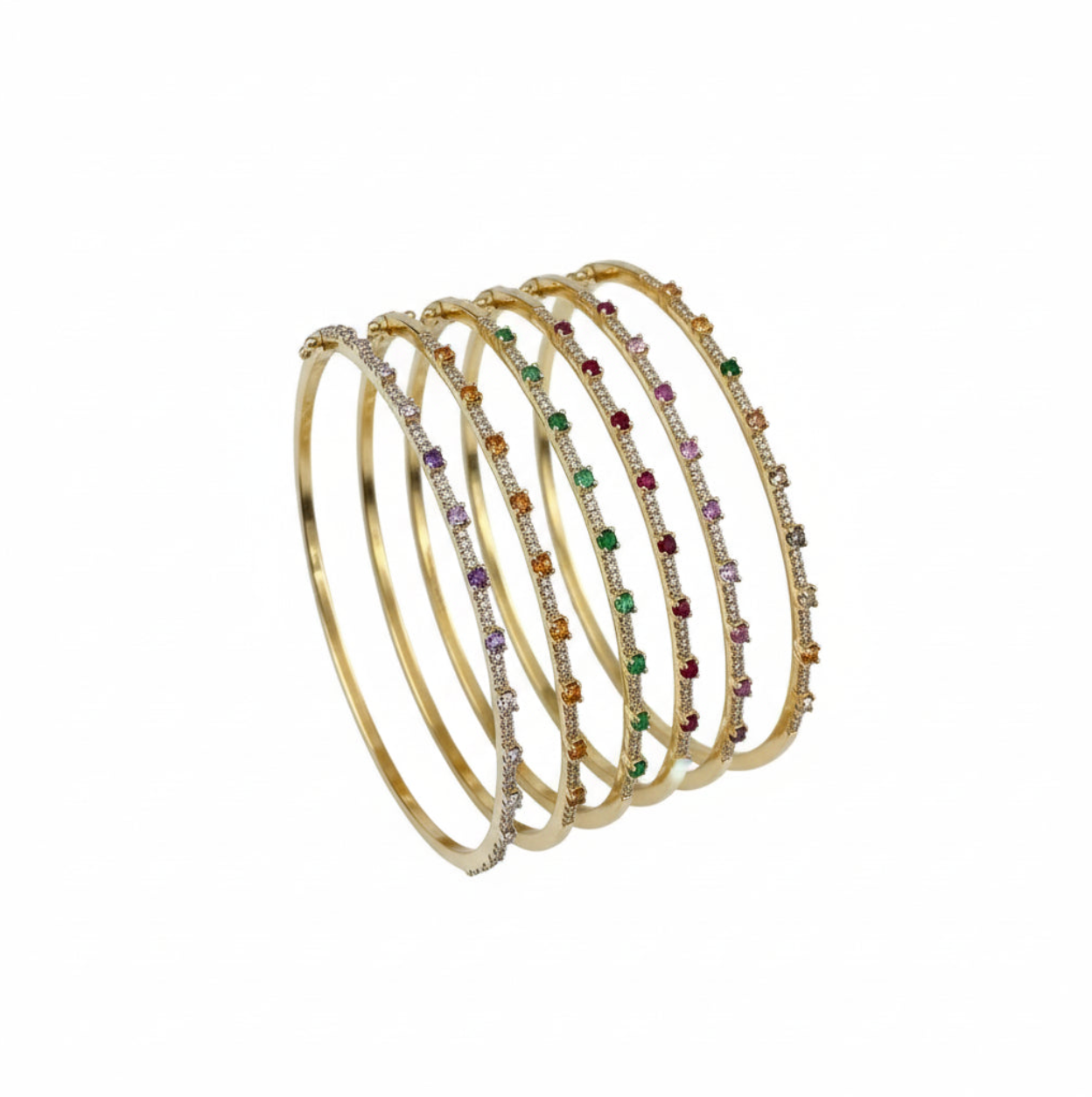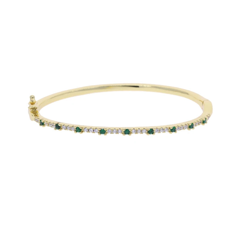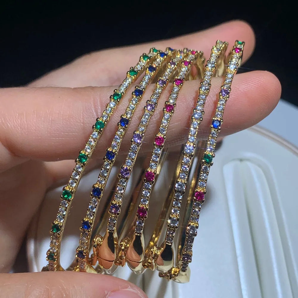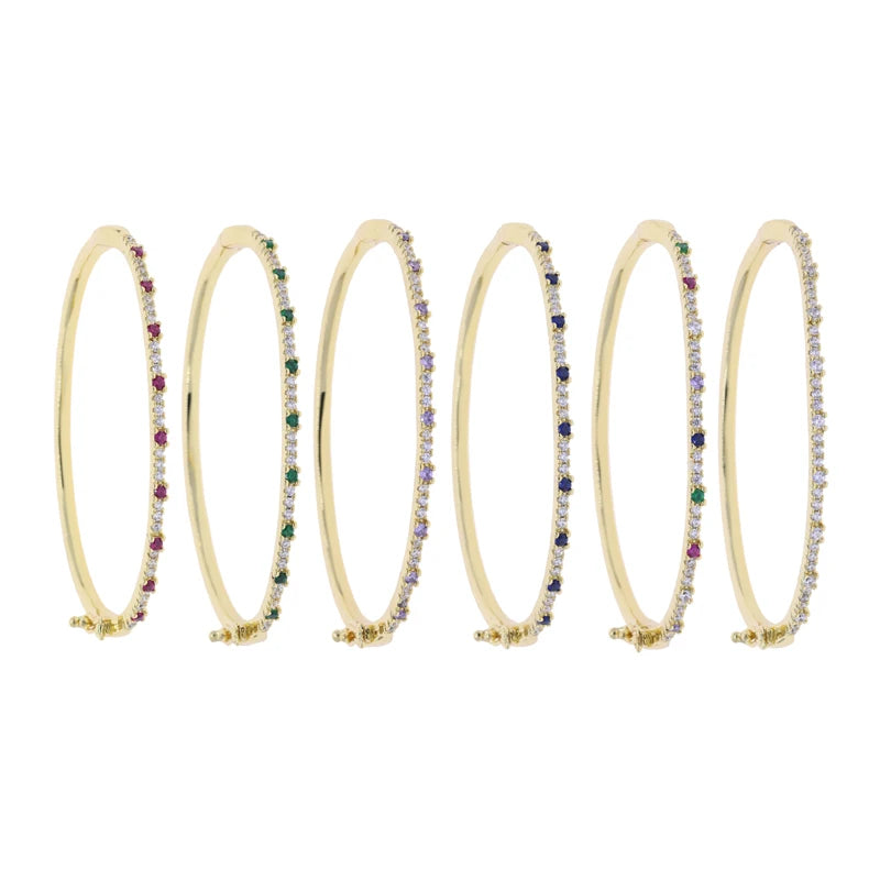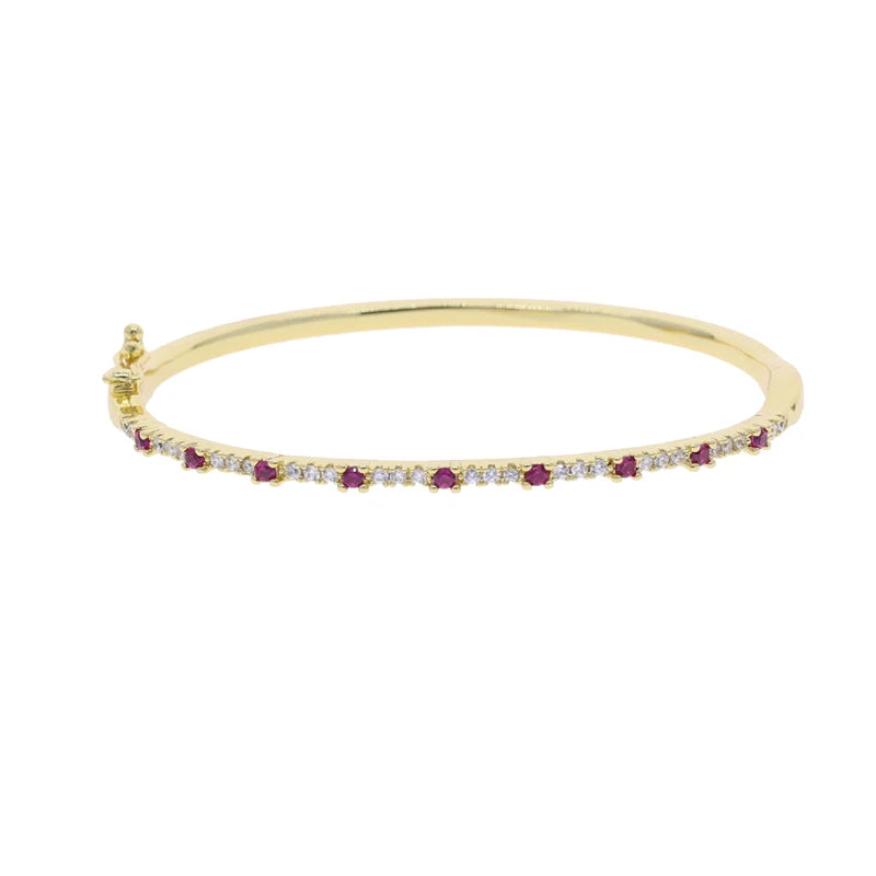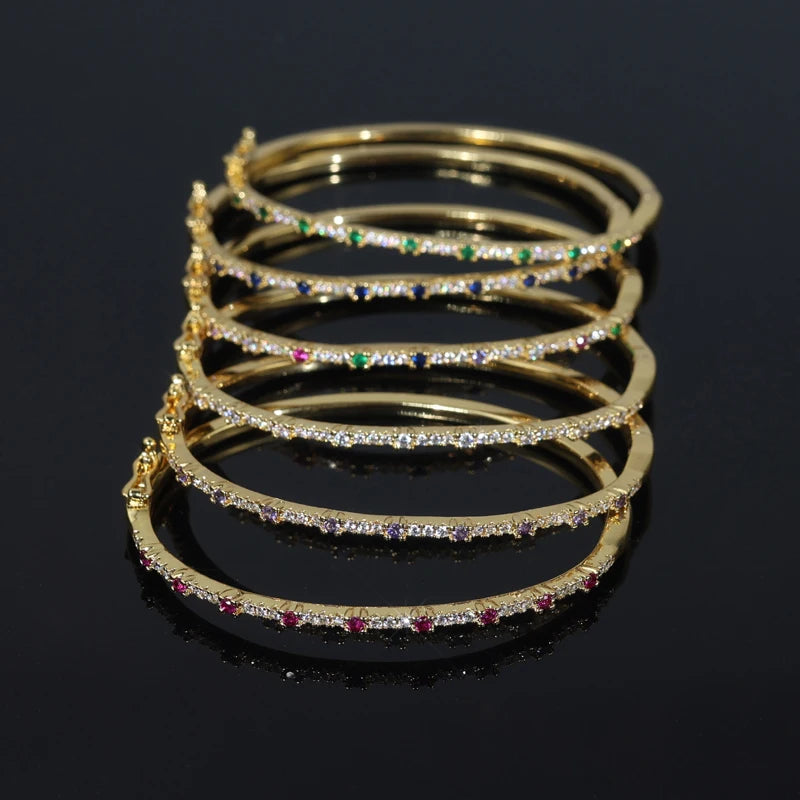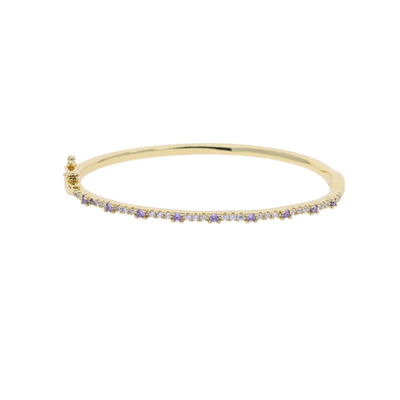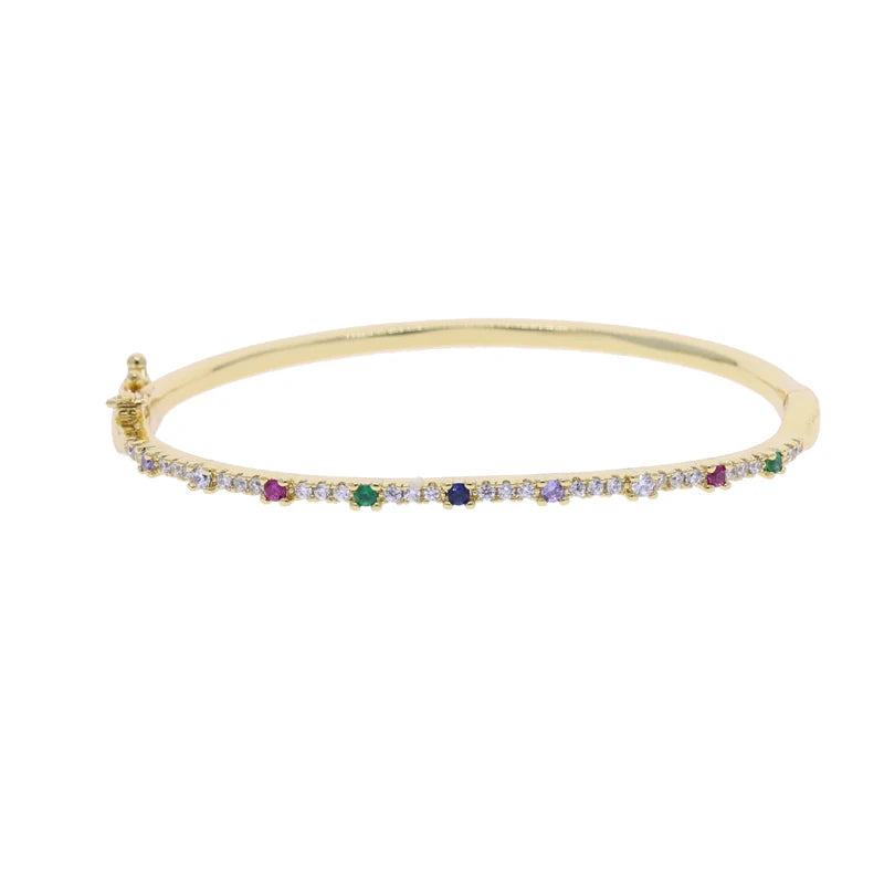 A slim, sparkling bracelet lined with vibrant, multi-colored stones that catch the light beautifully. Its sleek design makes it perfect for stacking or wearing alone for a subtle pop of color.